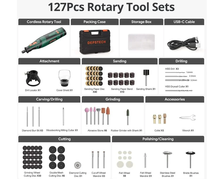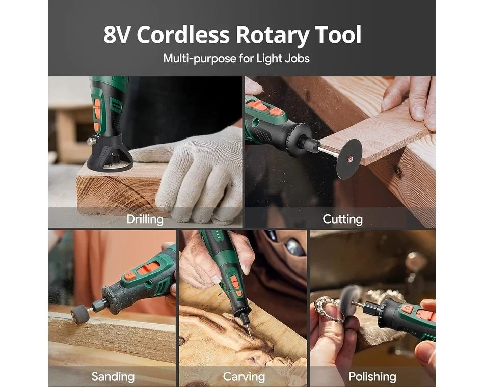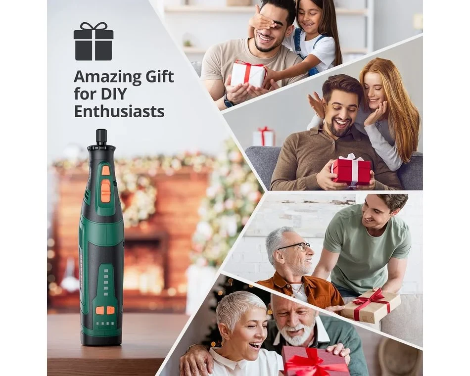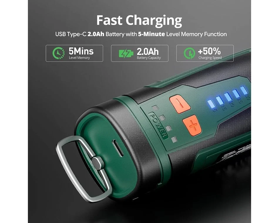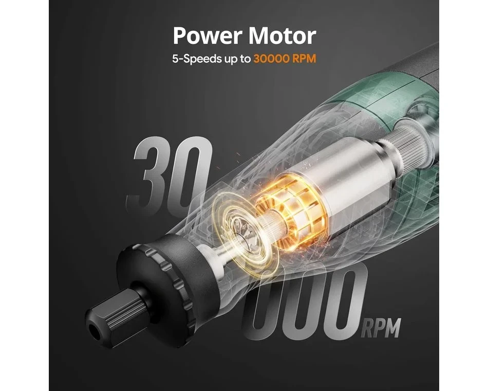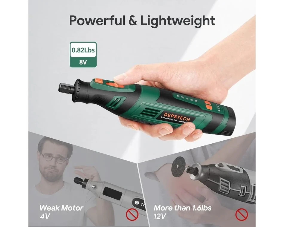 A Depstech DC08 8V-os forgószerszám akkumulátoros, mégiserős és stabil teljesítményt tudnyújtani. Az 5 változtatható fordulatszám5000 és 30 000 fordulat/perc között rugalmas forgási sebességbeállításokat tesz lehetővé. Asebességbeállítást is képes megjegyezni, így nem kell folyamatosan állítania a sebességet rövid időközönként. Az 5 perc elteltével visszatér az alapértelmezett sebességfokozatra. Szinte mindenbarkácsolási és barkácsolási igényét kielégíti. Ez a vezeték nélküli forgószerszám 2000 mAh-s akkumulátorral és USB Type-C töltőcsatlakozóval rendelkezik, amely megkönnyíti a töltést, bárhol is legyen.