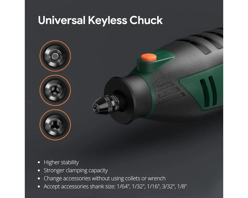 Az elektromos szerszám a jobb stabilitás érdekében univerzális hárompofás tokmányt tartalmaz.Használható 1/64" és 1/8" szárú tartozékokkal, és kompatibilis minden más márkájú forgószerszám tartozékkal, például a Dremel és a GOXAWEE tartozékokkal. Afaragószerszámok tartozékait is gyorsan, kulcs vagy fogó használata nélkülcserélheti. A védőburkolat megvédi Önt a szikrázástól vágás közben.