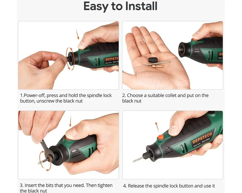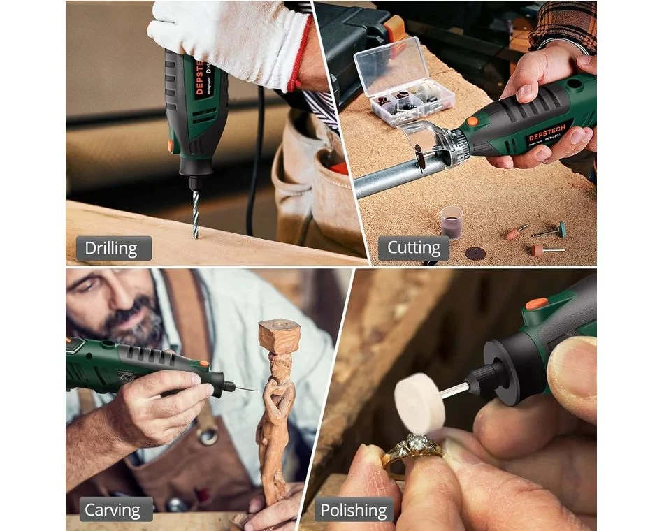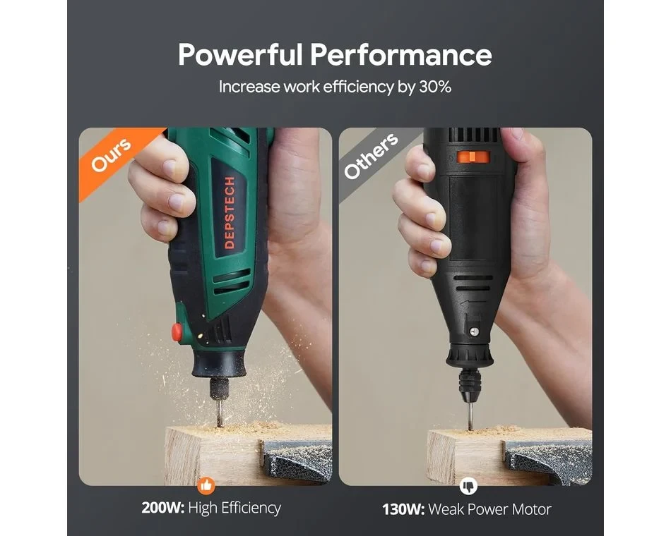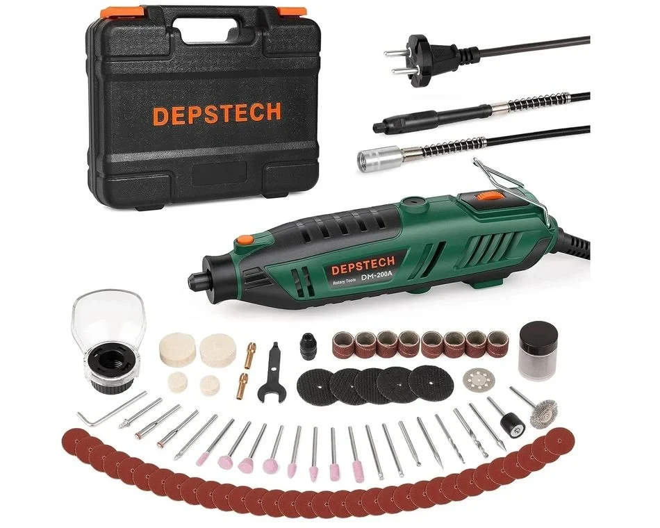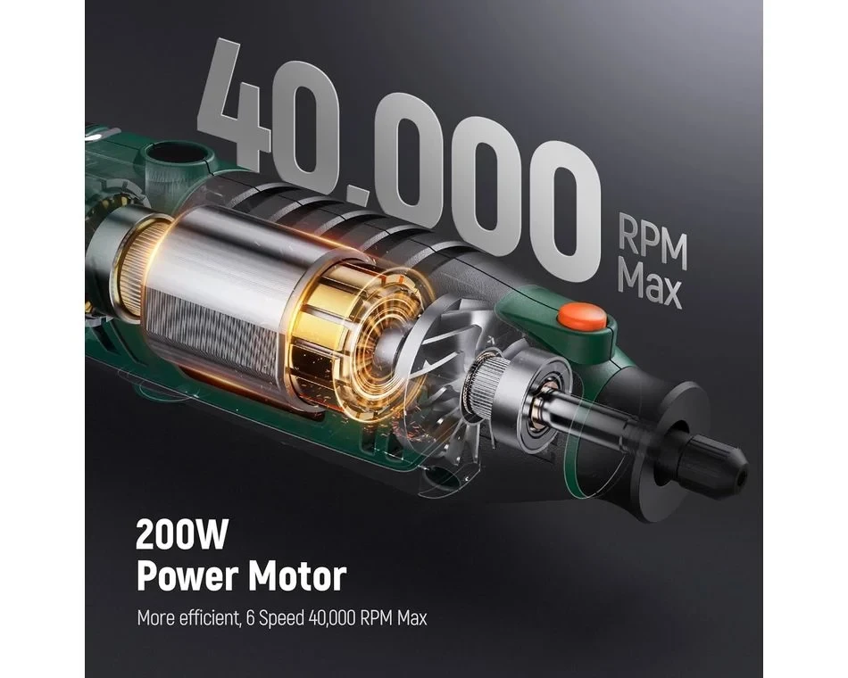 A Depstech forgószerszámkészlet nagy teljesítményű 200 W-os tiszta réz motorral, 6 változó fordulatszámmal rendelkezik 10 000 és 40 000 fordulat/perc között, hogy simábbá tegye a munkát, és akár 30%-kal növelje a munka hatékonyságát. Könnyedén szabályozhatja a forgószerszám sebességét a finom gravírozáshoz fában, üvegben, fémben és más anyagokban. A rugalmas tengely javítja a termék rugalmasságát, alkalmas finom polírozásra, gravírozásra vagy csiszolásra, és könnyen kezelhető a nehezen hozzáférhető csöveken, kapcsolódási pontokon és sarkokon. Szabadítsa meg kezét a stressztől, és fedezze fel, hogy mit jelent a könnyű barkácsolás.