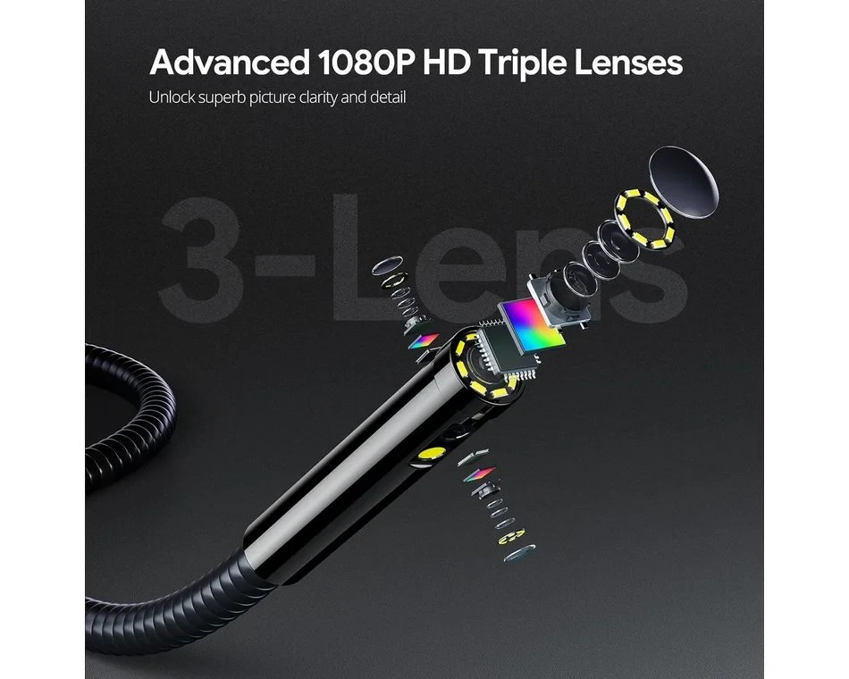 Ellenőrző kamera forradalmi 7"-os ultraszéles IPS képernyővel. A nagy, kristálytiszta kijelzőn egyszerretöbb részletet láthat,lenyűgöző tisztasággal és pontossággal, csökkentve az ismételt ellenőrzések szükségességét és növelve a munka hatékonyságát. Az IPS technológia jobb színpontosságot és szélesebb betekintési szögeket biztosít. Ez az innovatív kamera három önvilágító lencsét is kínál, így a professzionális szerelők, vízvezeték-szerelők és barkácsolók számára nélkülözhetetlen eszköz. A három lencse különböző szögekből rögzíti a képeket, így átfogóbb képet ad az ellenőrzési területről.