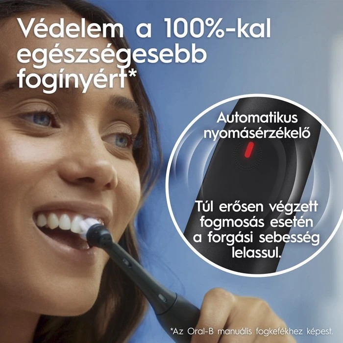 ÓVJA FOGÍNYÉT az AUTOMATIKUS FOGÍNYVÉDŐ NYOMÁSÉRZÉKELŐVEL, amely lassítja a forgási sebességet, és pirosan világít, ha túl erősen mos fogat