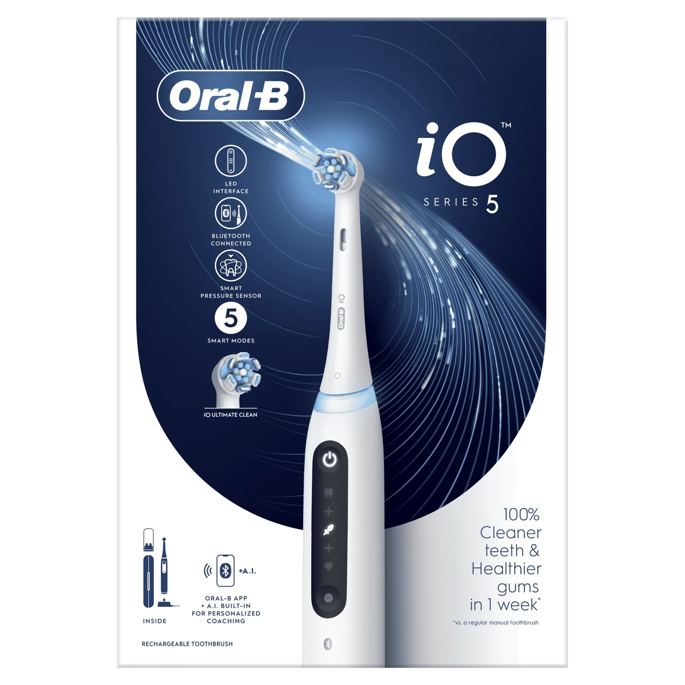 Az iO 5 elektromos fogkefe az Oral-B legkiválóbb technológiáját alkalmazza, amely ötvözi a fogászati eszközök ihlette kerek fogkefefejet és a gyengéd mikrovibrációt kibocsájtó sörtéket, a professzionális tisztaság érzéséért otthonában is. Az okos nyomásérzékelő segít megelőzni a túl erősen vagy túl gyengén végzett fogmosást a fogíny védelme érdekében. A mesterséges intelligencia alapú fogmosás-felismerő funkció a fogmosási stílus felismerésével nyújt útmutatást a hatékonyabb fogmosáshoz nap mint nap. Csatlakozik az ingyenes Oral-B alkalmazáshoz, nyomon követi a fogmosást, és valós idejű útmutatást nyújt mind a 6 fogmosási zónában. A legjobb eredmény érdekében 3 havonta cserélje le az Oral-B iO fogkefefejet.