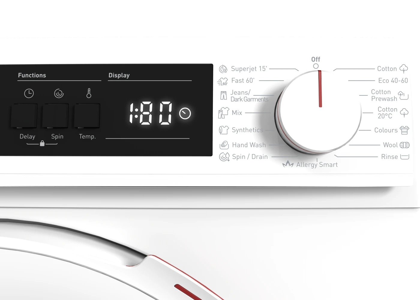 Többféle program (16 program) – Cotton, Eco 40-60, Cotton Prewash, Cotton 20°C, Colours, Wool, Rinse, Allergy Safe, Spin/Drain, Hand Wash/Delicate, Synthetics, Mix, Jeans, Fast 60’, Rapid 15 min, OFF.