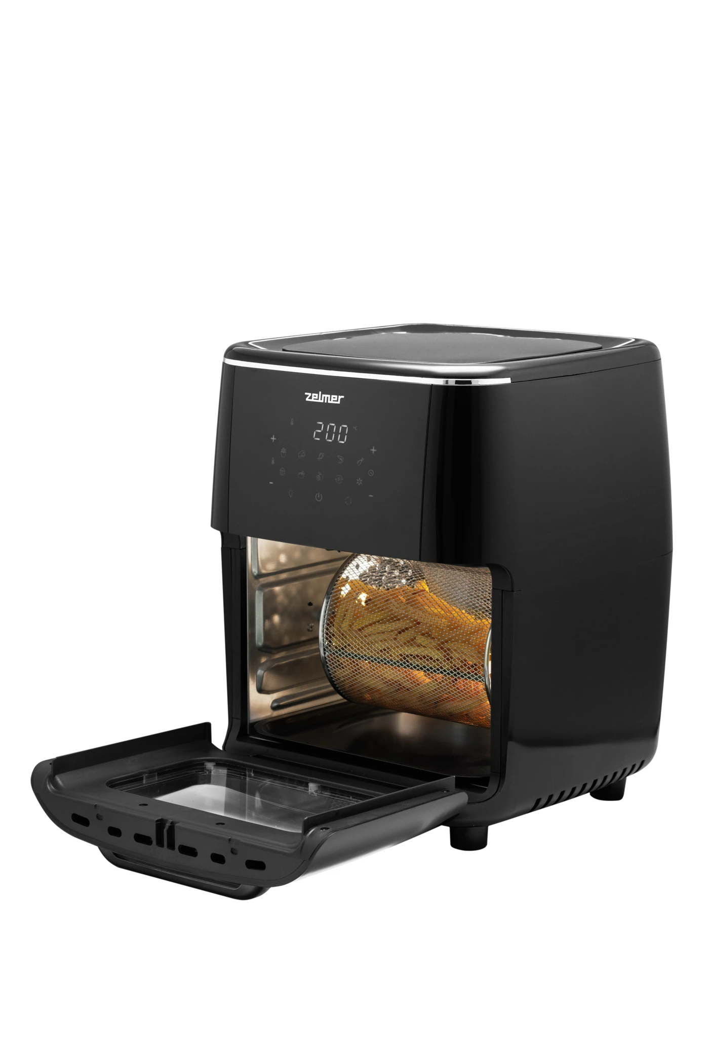 6 tartozék: 2 tepsi, olajtálca, leadó rács, 2,9 literes forgó kerek kosár és forgóhorgok