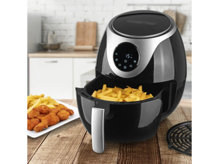 A GOURMETmaxx digitális forrólevegős sütőjével felfedezheti a sütés és az előkészítés újszerű egyszerűségét. A gyorsan keringő forró levegő és a fűtőelem okos kombinációja nemcsak extra gyorsan és kíméletesen főzi meg kedvenc ételeit, hanem lényegesen kevesebb energiát és zsírt is igényel, mint a hagyományos készülékek. Akár fagyasztott hasábburgonyát is készíthet további olaj nélkül. Várja a finom élvezetet további kalória nélkül!